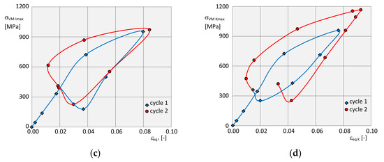 The dependence of the instantaneous maximum equivalent stress on the corresponding instantaneous strain at the respective isotropic hardening point is shown for in Figure 19a,c, and the dependence on for kinematic hardening for α, β in Figure 19b,d, in both cases for two complete loading cycles. In both dependencies, it is also possible to clearly identify residual normal stresses , and residual strains , due to the plastic deformation after the end of loading. In addition, at the end of each of the two load cycles, the stresses began to increase slightly again.