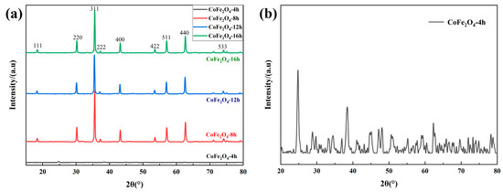 X-ray diffraction analyzer (XRD) pattern of cobalt ferrites; (a) the cobalt ferrite with different reaction time; (b) the product of 4h reaction time.