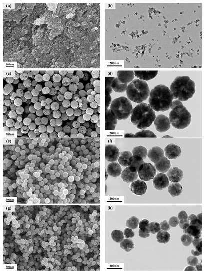 Scanning electron microscope (SEM) and transmission electron microscope (TEM) images of cobalt ferrite for different reaction times. SEM images: (a) 4 h, (c) 8 h, (e) 12 h, (g) 16 h; TEM images: (b) 4 h, (d) 8 h, (f) 12 h, (h) 16 h.