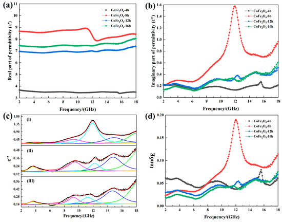 As shown in Figure 3d, when the reaction time is 8 h, the cobalt ferrite has a strong electric loss ability. However, the tanδE of CoFe2O4-12h and CoFe2O4-16h is lower than CoFe2O4-4h, due to the large real parts and low imaginary parts of effective permittivity of CoFe2O4-12h and CoFe2O4-16h. In summary, when the reaction time is 8h, the cobalt ferrite has strong dielectric polarization ability and electric loss ability.