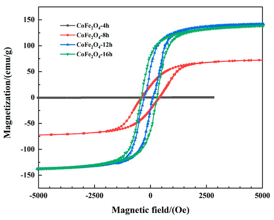 To analyze the effect of the different reaction times of cobalt ferrites on the magnetic properties, four groups of samples were tested using a comprehensive physical property-measurement system at room temperature. In addition, the M-H curve was recorded. The saturation magnetization and coercivity of the material can be observed via the magnetization curve. Figure 4 shows that the magnetization curves of the cobalt ferrites (with reaction times of 8 h, 12 h and 16 h) show a hysteresis loop pattern, which suggests the formation of ferromagnetic cobalt ferrite. When the reaction time was 4 h, and because it occurred in the early stage of cobalt-ferrite growth, the product had almost no magnetic properties. When the reaction time increases, the cobalt ferrite particles grow mature and exhibit excellent magnetic properties. By comparing the hysteresis loops of cobalt ferrite at 8 h, 12 h, and 16 h, it can be found that the degree of growth of cobalt ferrite has a great effect on the magnetic properties. When the reaction time is 8 h, a hollow cobalt ferrite formed. For the magnetic properties, the coercive force is closely related to the grain size. For generally spherical particles, the coercive force increases as the particle size decrease. After the particles reach the critical single domain size, their coercive force decreases with decreasing size. For hollow spheres, when the size of the hollow reaches a certain value, and the shell thickness reaches the critical single domain size, the hollow sphere can assume an approximate single-domain structure. Compared with the multi-domain structure, the magnetization process transforms from domain wall motion to magnetic moment rotation, and its coercive force is greater. The coercive force is inversely proportional to the saturation magnetization. The saturation magnetization of the CoFe2O4-8h is smaller than for the other two samples. When the reaction time is 12 h, due to the formation of solid cobalt-ferrite balls, the advantage of the hollow is lost. As a result, the coercive force decreases and the saturation magnetization increases. When the reaction time is 16 h, the size of the cobalt–ferrite particles decreases but it is larger than the critical single-domain size. Therefore, when the particle size decreases, the coercive force increases, and the saturation-magnetization decreases. In conclusion, the saturation magnetization and magnetic properties of little size cobalt ferrites are higher than those of hollow cobalt ferrites.