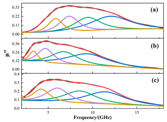 The fitting curve of the imaginary part of effective permeability, (a) 8 h; (b) 12 h; (c) 16 h.