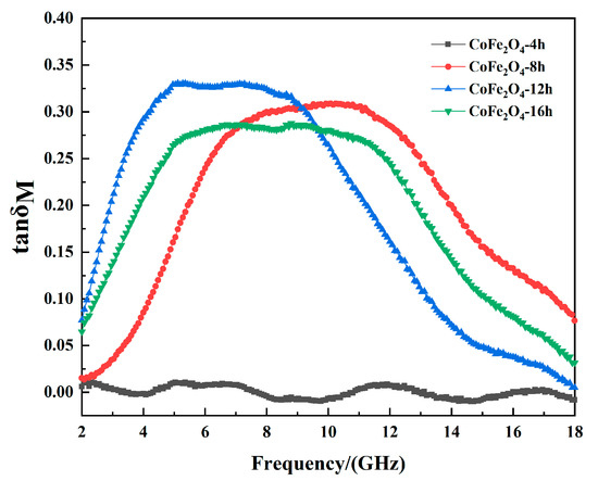 Figure 5 shows the real and imaginary part of effective permeability and magnetic loss factor of cobalt ferrite with different reaction time. As shown in Figure 5a,b, When the reaction time is 4 h, the cobalt ferrite crystal structure is unstable due to its in the early stage of growth. This means that it cannot show excellent effective permeability as it at high frequencies. In addition, when the reaction time is 8 h, 12 h and 16 h, as the frequency increases, the real part of effective permeability first rises to the maximum value, and then decreases rapidly, the final value stabilizes at about 0.9. The real part of the effective permeability of the three samples has a resonance peak near 4.4 GHz, 2.32 GHz and 2.29 GHz. Meanwhile, in the frequency range of 2–18 GHz, the imaginary part of the effective permeability of the three sets of samples has a wide resonance band.