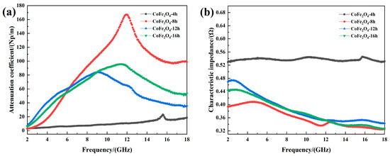 Figure 8 shows the attenuation coefficient and characteristic impedance of cobalt ferrite with different reaction times. Figure 8a shows that the attenuation coefficient of CoFe2O4-8h is better, and the peak frequency is higher. Furthermore, CoFe2O4-8h has a larger effective permittivity, which results in a larger attenuation coefficient because the frequency of its effective permittivity and effective permeability peak are higher than for the other three groups of cobalt ferrites, and the CoFe2O4-8h shows stronger electromagnetic wave attenuation at high frequencies. The special hollow structure of cobalt ferrite leads to multiple reflections of electromagnetic wave energy within its cavity. The hollow structure effectively improves conduction loss, which means the attenuation coefficient of CoFe2O4-8h is higher than for CoFe2O4-12h and CoFe2O4-16h. In addition, the attenuation coefficient of CoFe2O4-16h is slightly higher than for CoFe2O4-12h. This is the result of an increase in specific surface area, which leads to a higher degree of surface polarization relaxation and the magnetic crystal anisotropy coefficient. However, electromagnetic wave absorption depends on the attenuation coefficient and impedance matching characteristics. The increase of the effective permittivity can result in a larger ratio of effective permittivity to effective permeability, which leads to a smaller characteristic impedance of the material. As shown in Figure 8b, the characteristic impedance of CoFe2O4-8h is smaller than for the other three groups. It can be found that during the preparation of the absorption material, the electromagnetic parameters should be adjusted correctly. Furthermore, the attenuation ability and impedance matching characteristics of the material should be considered.