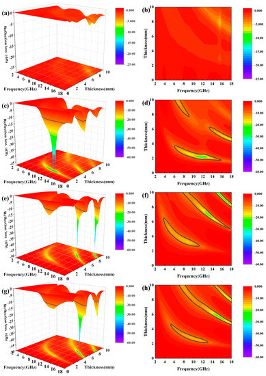 In order to visually describe the effect of reaction time on the microwave absorption performance, a three-dimensional model (return-loss/frequency/thickness) was established according to the transmission line theory [27,28]: