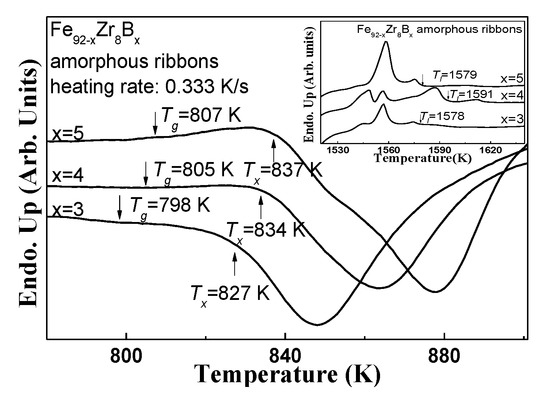 The amorphous feature of the Fe92−xZr8Bx ribbons prepared under the linear velocity of 30 m/s can be further confirmed from their differential scanning calorimetry (DSC) trace (Figure 2). The obvious endothermic glass transition behaviors before the crystallization and the visible crystallization exothermic peak (see the small figure in Figure 2) also verify the amorphous characteristics of the ribbon. As seen from the DSC trace, the onset temperatures of glass transition (Tg) of Fe92−xZr8Bx (x = 3, 4, 5) are about 798 K, 805 K, 807 K; and crystallization (Tx) is about 827 K, 834 K, and 837 K, respectively.