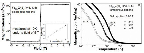 - Mishra, D.; Gurram, M.; Reddy, A.; Perumal, A.; Saravanan, P.; Srinivasan, A. Enhanced soft magnetic properties and magnetocaloric effect in B substituted amorphous Fe-Zr alloy ribbons. Mater. Sci. Eng. B 2010, 175, 253–260. [Google Scholar] [CrossRef]