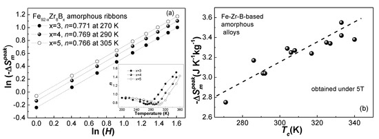 - Yu, P.; Zhang, J.Z.; Xia, L. Effect of boron on the magneto-caloric effect in Fe91−xZr9Bx (x= 3, 4, 5) amorphous alloys. J. Mater. Sci. 2017, 52, 13948–13955. [Google Scholar] [CrossRef]