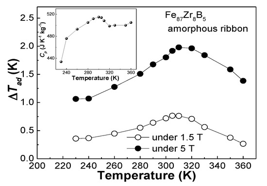 The ΔTad-T curve of the Fe87Zr8B5 glassy ribbon is shown in Figure 7, the inset is the Cp(T)) curve. The maximum ΔTad for the Fe87Zr8B5 metallic ribbon is about 0.76 K under 1.5 T, and 1.98 K under 5 T, respectively.