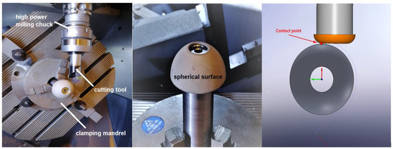 In the presented experiment, a hemispherical steel surface with a diameter of 50 mm and a height of 15 mm (substrate) was covered with a coating based on NiCrBSi alloy. Figure 1 is a view of the concerned workpiece, including a 5-axis machining head.