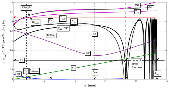 Figure 10 is relatively complex; however, due to the effort to capture the interrelationships of functions, it was used to show the triple layering between the materials of a very strong substrate and a softer coating, which, however, acquires hardness in the phases of recrystallisation solidification due to ion redistribution. In the middle between them, an intermediate layer of transition material is drawn. However, the mechanical parameters of all three material layers can be known to us because they can be exactly identified on the basis of current knowledge. The values of the melting points TmeltE, the position of the thermodynamic intersections TDpoints and the values of the yield strength Re are very suitable and relatively easy to use for identification. Subsequently, the tensile modulus of elasticity Emat can be derived for individual layers of a given three-component material bonding system.