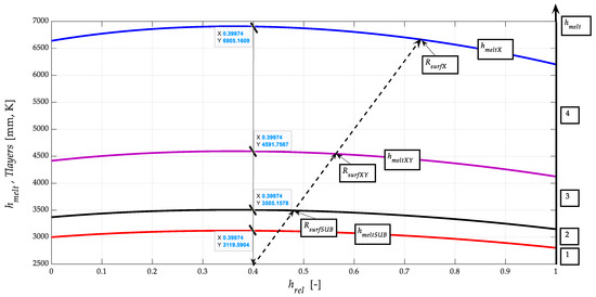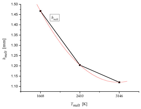 The derived parameter melt depth hmelt (mm) will be very much needed in many other applications of technical practice. The graph for the melting depth hmelt is a polynomial of the 2nd degree, according to Figure 11, where the total accuracy R2 = 1 (39).