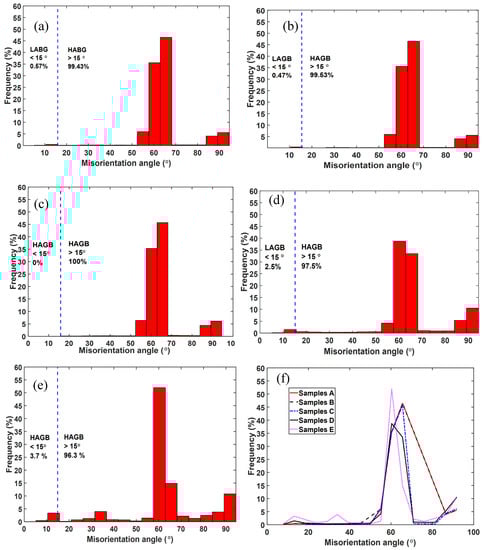 3.2. Misorientation Distribution in Various Microstructures of DMLS Ti6Al4V (ELI)
