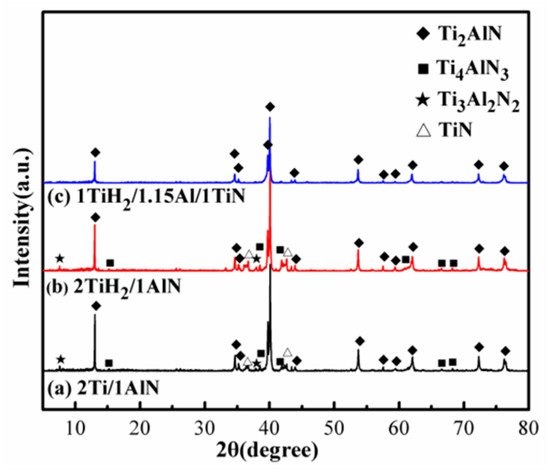 XRD patterns of (a) 2Ti/1AlN; (b) 2TiH2/1AlN; and (c) 1TiH2/1.15Al/1TiN prepared by microwave sintering for 30 min at 1250 °C.