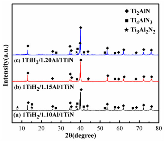 Al evaporation takes place at high temperatures, and its absence can alter the mixture proportion in a reaction system, thus a small amount of non-stoichiometric composition is necessary [28]. The XRD patterns of the samples prepared by the microwave sintering of 1TiH2/(1 + x)Al/1TiN (x = 0.1, 0.15, 0.2) for 30 min at 1250 °C are displayed in Figure 3. The representative diffraction peaks appeared from the Ti2AlN, Ti3Al2N2, and Ti4AlN3 phases at a TiH2:Al:TiN molar ratio of 1:1.1:1 (Figure 3a). When the Al molar relative content increased to 1.15, only a single-phase Ti2AlN ceramic with a small amount of Ti4AlN3 was obtained (Figure 3b), suggesting that the increased Al content in the mixed powder facilitated the synthesis of high-purity Ti2AlN as a little Al volume was possibly lost due to evaporation during sintering. At the over-weighed Al content (Figure 3c), the diffraction peaks of the Ti4AlN3 and Ti3Al2N2 impurity phases were enhanced. The estimated purity values of Ti2AlN powders prepared from 1TiH2/(1 + x)Al/1TiN (x = 0.1, 0.15, 0.2) were 74.85, 96.68, and 87.14 wt %, respectively. Based on these results, the value of x was set to 0.15.