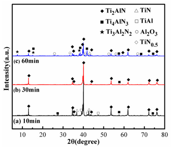 The XRD patterns of the 1TiH2/1.15Al/1TiN powder mixture sintered at 1250 °C for 10, 30, and 60 min are displayed in Figure 4. In the 1TiH2/1.15Al/1TiN system prepared by sintering at 1250 °C for 10 min, Ti2AlN existed as the primary crystalline phase with TiN, Ti4AlN3, and un-reacted TiAl (PDF#65-5414) phases (Figure 4a). However, when the holding time was extended to 30 min (Figure 4b), Ti2AlN and a small amount of Ti4AlN3 existed as the main phases and the diffraction peaks of TiN and TiAl almost disappeared, indicating a complete synthesis of Ti2AlN when sintering was carried out for 30 min at 1250 °C. When the sintering time was extended to 60 min ((Figure 4c), except for the Ti2AlN phase, the impurity phases such as TiN, Ti4AlN3, Ti3Al2N2, TiN0.5 (PDF#76-0198) and Al2O3 (PDF#74-1081) also existed in the system. This happened because, during this long heat preservation period, a part of the Ti2AlN phase was decomposed to form TiN, TiN0.5 and gaseous Al [37]. In addition, the gaseous Al phase was easily oxidized at 1250 °C to form a small amount of Al2O3. At the same time, the Ti2AlN phase tends to change into Ti4AlN3 and Ti3Al2N2 phases at prolonged high temperature [38]. The relative purity values of Ti2AlN powders prepared by sintering at 1250 °C for 10, 30, and 60 min were calculated as 84.78, 96.68, and 57.01 wt%, respectively. Therefore, the microwave sintering holding time was set as 30 min.