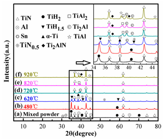 Figure 5 exhibits the XRD patterns and enlargements in the 34°–45° region of the 1TiH2/1.15Al/1TiN powder sample after 1 min of sintering at different temperatures (480–920 °C). It is clear from Figure 5a that at ambient temperature, the crystalline phases of the as-prepared powders were almost similar to those of TiH2 (PDF#25-0983), Al (PDF#85-1327), and TiN (PDF#87-0633) starting materials (except for a very small amount of Sn (PDF#65-7657)), which indicates that ball milling made no difference in the powder mixture composition. At 480 °C (Figure 5b), the phase structure did not change greatly as compared to that after ball milling. However, the peaks of 34.9° (111) and 40.5° (200) of TiH2 slightly shifted to higher angles, demonstrating that TiH2 had a tendency to dehydrogenate. When the sample was sintered at 620 °C (Figure 5c), no TiH2 (111) peak appeared and new TiH1.5 (PDF#78-2216) and α-Ti (PDF#65-3362) phases were generated from the dehydrogenation of TiH2 [39]. In addition, TiN0.5 and Ti2Al (PDF#47-1410) phases were also detected, suggesting that a part of TiN and Al reacted with α-Ti to form a small amount of TiN0.5 and Ti2Al under the melting point of Al. At the sintering temperature of 720 °C (Figure 5d), the peaks of TiN, Ti2Al, TiAl2 (PDF#52-0861), TiAl, and Ti2AlN appeared above the melting point of Al. In addition, TiH1.5, α-Ti, TiN0.5 and Al eventually disappeared, revealing the complete reaction of Al with α-Ti to Ti2Al, TiAl2, and TiAl at a sintering temperature higher than the melting point of Al. The Ti2AlN phase was detected at 720 °C, confirming the possibility of Ti2AlN synthesis at low temperatures. After microwave sintering below 820 °C (Figure 5e), no obvious change in the phase composition was noticed as compared to the sample sintered at 720 °C; however, the diffraction peaks of TiN became stronger. At 920 °C (Figure 5f), similarly to the sample prepared at 820 °C, TiN, Ti2Al, TiAl2, TiAl, and Ti2AlN phases were detected. However, the diffraction peaks of the TiAl and Ti2AlN phases were significantly enhanced. This happened because Ti2Al and TiAl2 reacted to form the TiAl phase, which then reacted with TiN to form the Ti2AlN phase at 920 °C.