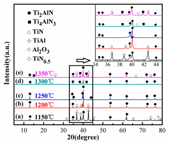 In order to determine the optimal microwave sintering temperature, the 1TiH2/1.15Al/1TiN powder system was subjected to heating at different temperatures from 1150 to 1350 °C for 30 min at an interval of 50 °C, and the corresponding XRD patterns are displayed in Figure 6, where the 34°–45° region is magnified. It is clear from Figure 6a that at the sintering temperature of 1150 °C, Ti2AlN and TiN were the main crystalline phases with some un-reacted TiAl. However, at 1200 °C (Figure 6b), Ti2AlN became the dominant phase, and the diffraction peaks of TiAl and TiN almost disappeared. At the sintering temperature of 1250 °C (Figure 6c), the resulting products were composed of pure Ti2AlN, and the diffraction peaks of TiAl and TiN disappeared, indicating that single-phase Ti2AlN could be acquired at 1250 °C. At higher sintering temperatures (Figure 6d,e), the diffraction peak intensities of TiN, Ti4AlN3, TiN0.5, and Al2O3 increased slightly, indicating the decomposition of Ti2AlN to TiN formation at a sintering temperature greater than 1250 °C. The sample contained more TiN after sintering at a temperature lower than 1200 °C or higher than 1300 °C. Therefore, 1250 °C was adopted as the optimal microwave sintering temperature to synthesize high-purity Ti2AlN powder from the 1TiH2/1.15Al/1TiN raw material system.