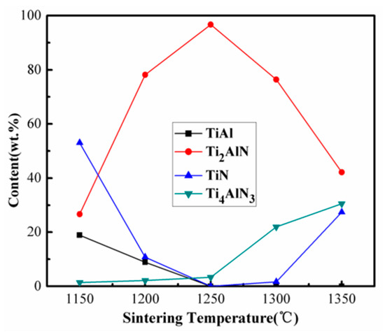 The relative contents of TiAl, Ti2AlN, TiN, and Ti4AlN3 in the resultant products of the 1TiH2/1.15Al/1TiN system sintered for 30 min at different temperatures (1150–1350 °C) are displayed in Figure 7. It is clear that the relative content of Ti2AlN increased greatly and those of TiAl, Ti2AlC, and TiC impurity phases declined at a sintering temperature higher than 1150 °C. The relative contents of Ti2AlN and Ti4AlN3 at 1250 °C were calculated as 96.68 and 3.32 wt %, respectively. However, when the temperature further increased, the relative content of Ti2AlN gradually decreased, and those of Ti4AlN3 and TiN increased due to the transformation of Ti2AlN into Ti4AlN3. Therefore, 1250 °C was set as the most appropriate temperature to synthesize Ti2AlN.