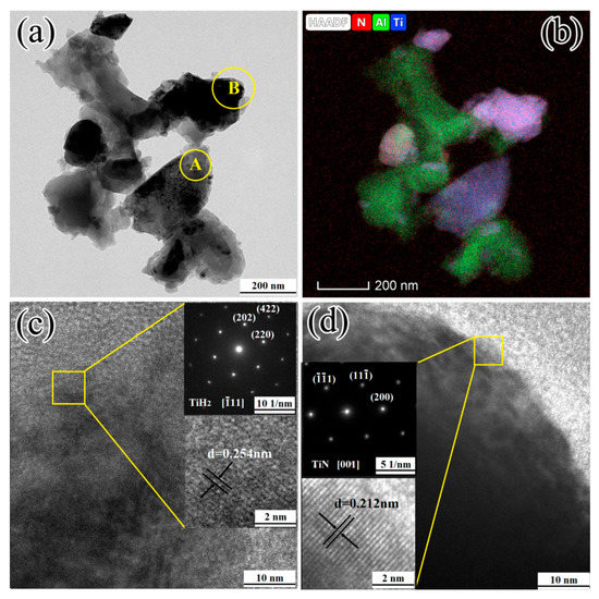 (a) TEM image; (b) elemental mapping of N, Al, and Ti; and (c,d) high-resolution transmission electron microscopy (HRTEM) image and selected area electron diffraction (SAED) pattern of 1TiH2/1.15Al/1TiN after one minute of sintering at 480 °C, respectively.