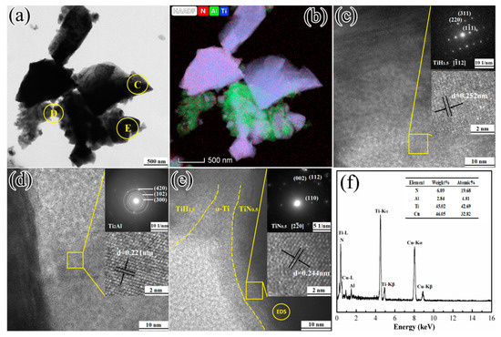 (a) TEM image; (b) elemental mapping of N, Al, and Ti; (c–e) HRTEM images and electron diffraction patterns; and (f) EDS analysis of the 1TiH2/1.15Al/1TiN powder system after one minute of sintering at 620 °C.