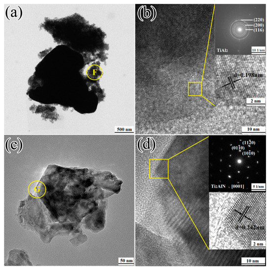 Figure 11 displays the TEM results of the 1TiH2/1.15Al/1TiN powder system after microwave sintering at 720 and 1250 °C. It is noticeable from the TEM image in Figure 10a that each black particle was surrounded by a large number of thin flaky particles. The HRTEM image and SAED pattern of region F in Figure 11a are displayed in Figure 11b. It is clear that the flaky particles in region F possessed the TiAl2 phase. The indices of the crystallographic plane of the TiAl2 phase were (220), (200), and (116) with an interplanar distance of 0.198 nm associated with the (200) plane crystal lattice spacing. According to the XRD result of Figure 5d, when the sintering temperature was above the melting point of Al, the reaction between Ti and Al generate the flaky TiAl2 phase that surrounded the TiN phase (Figure 11c). The HRTEM image and SAED pattern of region G in Figure 11c are presented in Figure 11d. It is clear that region G had the Ti2AlN phase. The crystal zone axis of the Ti2AlN phase was located on [0001] and grew along with the (100), (010), and (110) planes with an interplanar distance of 0.242 nm associated with the (102) plane crystal lattice spacing. The powder sample sintered at 1250 °C possessed a hexagonal microstructure.
