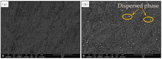 It can be seen in Figure 4 that the flow stress of the fine-grained samples was higher than that of the coarse-grained samples at a deformation temperature of 1000–1100 °C. In general, due to Zener pinning, dispersion is of great significance to the microstructure evolution of alloys [15]. The pinning effect is related to the size, volume fraction, and spatial distribution of the dispersed phase. Typically, the fine dispersed phase (<1 μm) will pin the grain boundary, thus hindering the nucleation and growth of recrystallization. In this study, the particle size of the dispersed phase was 0.27–0.32 μm; thus, the grain boundary was pinned by Zener pinning. In Figure 5, it can be seen that a large number of dislocations were generated around the dispersed phase, which is attributed to the pinning effect of the dispersed phase. In general, true stress–strain curves can be considered as a macroscopic reflection of the microstructural evolution of materials. The interaction between the dispersed phase and dynamic recrystallization has different effects on the flow stress level. More specifically, when the dispersed phase inhibits dynamic recrystallization, the flow stress usually significantly increases [24]. Hence, under most deformation conditions, the flow stress of fine-grained samples is higher than that of coarse-grained samples, which can be attributed to the pinning effect of the dispersed phase.