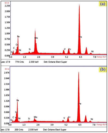 Energy dispersive X-ray spectroscopy (EDS) results of (a) the dispersed phase and (b) the matrix of M50NiL steel.