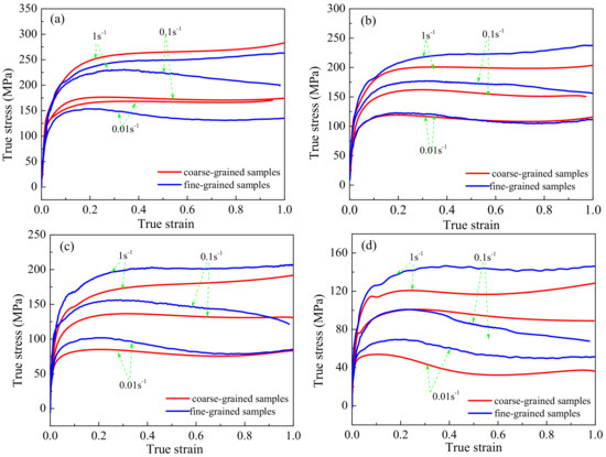 - The true stress–strain curve can be considered a macroscopic reflection of the changes in the microstructure of a material. Under most deformation conditions, the flow stress of the fine-grained specimens was higher than that of the coarse-grained specimens, which is attributed to the pinning effect of the fine-grain dispersion on the grain boundary.
