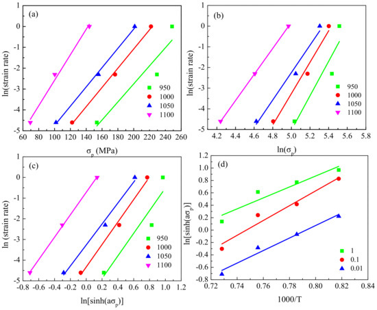 where T is the absolute temperature (K), is the strain rate (s−1), σ is the flow stress (MPa), Q is the activation energy (J·mol−1), R is the universal gas constant (8.314 J·mol−1·K−1), and n, , A, , , β, and α are the material constants. The value of α can be calculated according to .