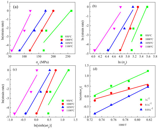 Relationships between: (a) and σp; (b) and lnσp; (c) and lnsinh(ασp); (d) lnsinh (ασp) and 1000/T, for the coarse-grained specimens.