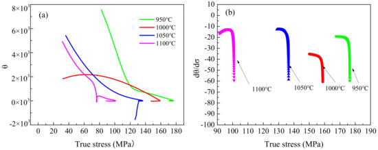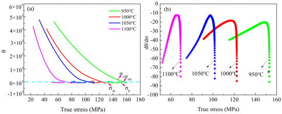 The critical strain of dynamic recrystallization constitutes one of the important indicators in the analysis of dynamic recrystallization behavior, since it can determine the strain required for the initiation of dynamic recrystallization [31]. The critical strain can be determined by metallurgical observations; however, this requires considerable effort and time. In [32,33], it was demonstrated that when dynamic recrystallization occurs, the curves of the hardening rate versus true stress exhibit an inflection point. The inflection point in the - curves corresponds to the maximum point of the curves. The - and curves derived based on the obtained true stress–strain curves are shown in Figure 8 and Figure 9. Subsequently, the critical strains under different hot deformation conditions were determined.