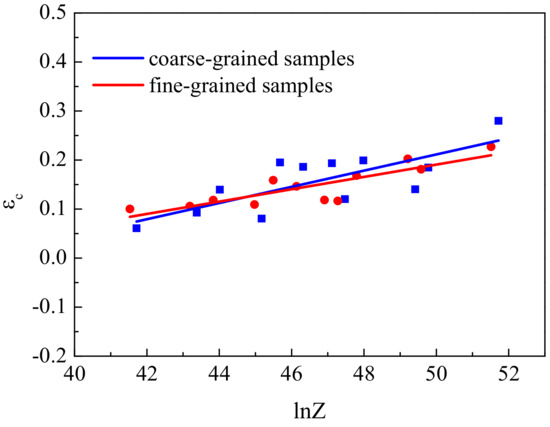 As mentioned above, the dynamic recrystallization behavior is affected by the temperature and strain rate. Therefore, the critical strain can be expressed by the Z parameter as: