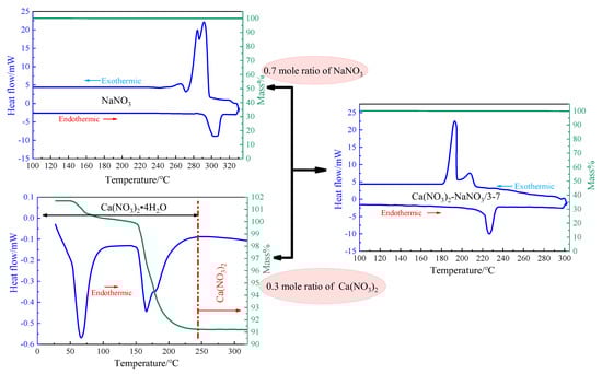 TG-DSC (differential scanning calorimeter) curves of sodium nitrate (NaNO3), calcium tetrahydrate nitrate (Ca(NO3)2·4H2O), and the binary eutectic nitrate (Ca(NO3)2–NaNO3/3-7).