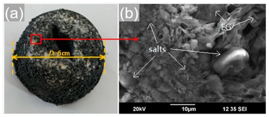 Melt-impregnation is a primary process for forcing the liquid salts to penetrate into the pores of the supporting materials. During this process, the supporting materials are immersed into the liquid PCMs, allowing for absorption by capillary action. Many previous studies have suggested that the inorganic PCM can be impregnated into EG by the conventional melt-impregnation method. For instance, Wu et al. [29] prepared the composite 50%Na2SO4·10H2O-50%Na2HPO4·12H2O/EG FS-PCMs by a physical blending and impregnation method. The hydrated salts were filled into pores or adhered onto the flakes of EG by physical interactions, including capillary forces and surface tension. Moreover, the composites fabricated by this method showed favorable thermal properties and low cost, making it promising for low-temperature thermal energy storage applications. Herein, we tried the simple melt-impregnation method by using EG (the mass fraction was 7 wt %) as the supporting material and the eutectic Ca(NO3)2–NaNO3 mixture as the PCM. The obtained Ca(NO3)2–NaNO3/EG mixtures were divided into four ceramic crucibles. Then, the four ceramic crucibles were placed in a vacuum furnace and maintained at 260, 280, 300, and 320 °C temperatures, respectively, for 5 h. However, it was verified that this is an ineffective method for forcing the liquid Ca(NO3)2–NaNO3 mixture into the pores of EG. The four different conditions yielded the same result in both morphology and structure. The digital photo and SEM image of the massive Ca(NO3)2–NaNO3/EG mixture heated by 280 °C are shown in Figure 3a,b. Notably, the capillary forces involved were not sufficient to allow liquid nitrate salts to pass through the surface of the porous materials. The result revealed that the conventional melt-impregnation method offered extremely low-permeability for the mixture with EG content of as low as 7 wt %. This could be caused by the fact that it was very difficult for EG to absorb a large quantity of liquid PCMs by simple immersion, owing to the pore space of the EG matrix being blocked up with the air [30]. Therefore, the conventional melt-impregnation method is ineffective for the fabrication of the Ca(NO3)2–NaNO3/EG mixture.