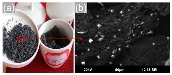 The melted PCMs can be easily retained within pores and adsorbed onto the flakes of EG, owing to their enormously high surface area-to-volume ratios. There are some desirable properties for choosing EG as the supporting material, just like chemical properties and economic aspects. Herein, EG was used as the supporting material for thermal conductivity enhancement. EG is a kind of modified graphite that has a layered structure with interlayer space [26]. It was prepared by immersing natural flake graphite into chromic acid and sulfuric acid, which forced the crystal lattice planes apart, thus expanding the graphite. Then, the mixture was dissolved in water, and the solution was filtered. The filtrate was collected and dried in the oven at temperature lower than 100 °C to ensure that the water did not boil. During this process, so-called “expandable graphite” was produced, as shown in Figure 1a. Finally, the expandable graphite was put into a vacuum muffle furnace with the expansion temperature starting at 800 to 1000 °C to expand with expansion ratios of 100, 150, 180, 200, 250, 280, and 300 times without oxidation [27,28]. The expanded graphite with an expansion ratio of 300 times is shown in Figure 1b. The raw materials of graphite flake (purity ≥99%) were obtained from Qingdao Co., Ltd., Qingdao, China