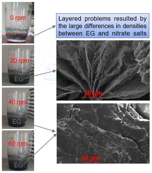 Stirring speed is a critical process parameter in the composite process that not only determines the homogeneous distribution of EG in aqueous solution of salts but also influences the loose and porous vermicular structure of EG. Therefore, we performed several runs at different stirring speeds: 0, 20, 40, and 60 rpm, as shown in Figure 5. From Figure 5, the Ca(NO3)2–NaNO3/EG mixture fabricated by a 0 rpm stirring speed ran into the problem of getting layered, owing to the large differences in density between EG and nitrate salts. On the contrary, after stirring for 10 min at 58 °C, a 20 rpm stirring speed showed some good results in uniform distribution, and the microstructure of EG remained intact. However, 40 and 60 rpm stirring speeds can destroy the loose and porous vermicular structure of EG. The above results revealed that the stirring speed influenced the microstructure and the uniform distribution of EG in the slurry. At a lower stirring speed with 10 min stirring time, the clustering of EG was obvious. As the stirring speed increased, a better distribution of EG in the slurries was formed. However, the fine structure of EG was destroyed when the stirring speed was bigger than 20 rpm. From the above results, it can be concluded that EG can be dispersed uniformly in an aqueous solution of salts after 10 min stirring with the speed of 20 rpm.