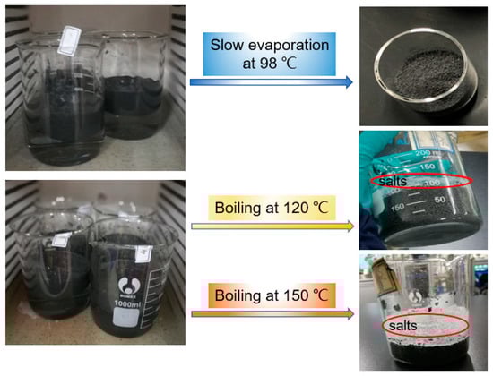 As mentioned in previous works, liquid water contained within the slurry can be dried by slow evaporation or boiling, and the results are shown in Figure 6. Unfortunately, once vapor has been produced by boiling, the nitrate salts are liberated upon boiling, as shown in Figure 6. It should be noted that the inter wall of the beakers and the upper surface of EG were covered by the salt particles after heating at 120 and 150 °C for 5 h. This result indicates that the heating temperature should be lower than its boiling point. Therefore, the slurry was heated to 98 °C to ensure that the water did not overheat, and then the slurry was dried up by maintaining its temperature at 98 °C for 5 h in a vacuum muffle furnace. Benefiting from this, the uniform distribution of Ca(NO3)2–NaNO3/EG mixture was finally obtained. Therefore, the evaporation temperature is a key parameter that influences the drying behavior. Although high temperatures lead to a shorter drying time due to more rapid heat and moisture transfer, they also lead to the leakage of soluble salts carried out by the boiling bubbles in boiling liquid. In conclusion, a low-temperature drying process is recommended to ensure that the salt particles are deposited homogeneously on EG. Due to the advantage of a low-temperature drying process, the leakage problem resulting from the boiling salt solution can be avoided.