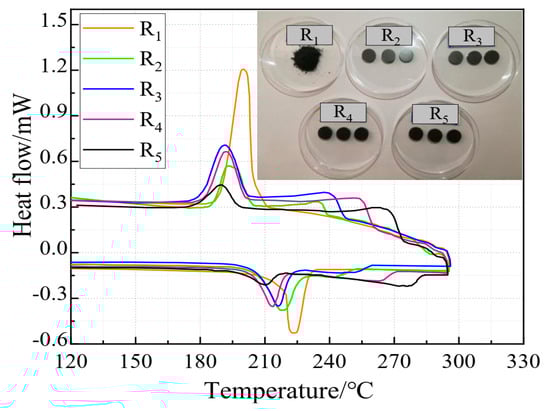 In this process, the mixed powders were uniaxially pressed into cylinders of 15 mm in diameter and 5 mm in length under a uniaxial pressure. To estimate the effect of cold-pressing pressure on the phase change behaviors of the Ca(NO3)2–NaNO3/EG composite FS-PCMs, different cold-pressing pressures (0, 4, 8, 12, and 16 MPa) were used in the present work, and the five samples were marked as R1, R2, R3, R4, and R5, respectively.