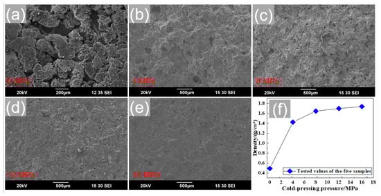 SEM images of the Ca(NO3)2–NaNO3/EG composites under different pressures: (a) 0 MPa, (b) 4 MPa, (c) 8 MPa, (d) 12 MPa, and (e) 16 MPa; and (f) effect of cold-pressing pressures on density of the composites.