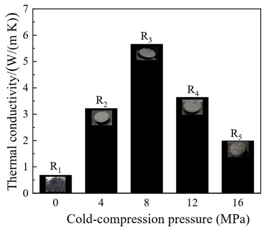 Thermal conductivity affects the rate of energy storage and release, and it is one of the most important factors in TES applications. Thermal conductivities of the binary eutectic salts and the composite FS-PCMs were measured at 25 °C, and the results are shown in Figure 11. All samples were fabricated with the following optimal operating parameters: the stirring speed of 20 rpm, the evaporation temperature of 98 °C, the melt-impregnation temperature of 280 °C, and the sintering temperature of 300 °C. R1 without cold-pressing exhibited the lowest conductivity of 0.68 W/(mK). In general, the thermal conductivity of the composites can increase significantly after cold-pressing. With the increase of the cold-pressing pressure, the thermal conductivity of the composite firstly increased, reaching a maximum of 5.66 W/(mK) at 8 MPa, and then it began to decrease. This may be attributed to the surface cracks on the samples R4 and R5 formed by thermal stress during the sintering process, indicating that the interlocking structure could be destroyed when the cold-pressing pressure was too large [34]. This verified that the densification and microstructure of the composite FS-PCMs reached its optimal state under the cold-pressing pressure of 8 MPa.