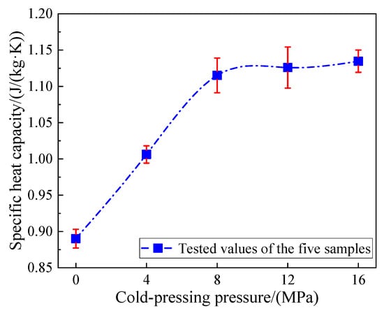 The variation of specific heat capacity with the cold-pressing pressure of the Ca(NO3)2–NaNO3/EG composites at room temperature is given in Figure 12. Greater enhancement in the specific heat capacity (from 0.89 to 1.12 j/(kg·k)) was observed from the FS-PCM samples with the increasing cold-pressing pressure from 0 to 8 MPa. This was probably due to the increasing density of the FS-PCMs, which could result in rapid heat transfer. However, with the cold-pressing pressure increasing from 8 to 16 MPa, the corresponding specific heat capacity was kept nearly unchanged, which was consistent with the fact that the density of the composite remained unchanged when the pressure was larger than 8 MPa.