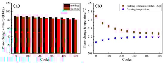 The prepared composites R4 and R5 had serious problems such as thermal expanding, cracking, and leakage, as shown in the inset of Figure 10. The results show that the R1 and R2 had greater mass losses than the sample R3. Therefore, in the present study, the composite R3 was investigated only. In this section, only the sample R3 was tested due to its superiority compared with other samples. The cycling stability of sample R3 was evaluated by a heating–cooling cycle device, and the results are presented in Figure 13. It is seen that the enthalpy changes of the composite FS-PCM after 500 heating–cooling cycles were negligible. After 500 cycles, the enthalpies of melting and freezing were 84.5 kj/kg and 80.23 kj/kg [25], dropping by 5.89% and 8.48%, respectively. As presented in Figure 13b, both the melting and freezing temperatures changed slightly during the first 300 cycles, and they remained nearly unchanged in the last 200 cycles. As stated in our previous work [25], the prepared composite R3 showed a good thermal reliability in terms of minor changes in its thermal stability and phase change behaviors.