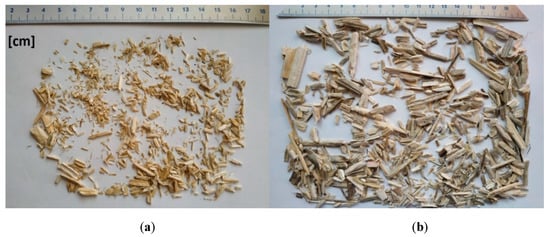 Two types of hemp shive different in fraction and origin were used as shown in Figure 1. The first type (fine) was produced by the Dutch company Hempflax, while the second one (thick) was produced by the Polish company Podlaskie Konopie. The mixtures made of them will be referred to as fine hemp shives (FHS) and thick hemp shives (THS). The shives constituted 50% of the total weight of each binder mix.