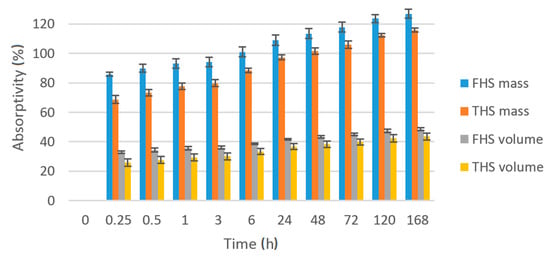 Increase in the volumetric and mass water absorptivity of composite samples over time.