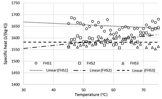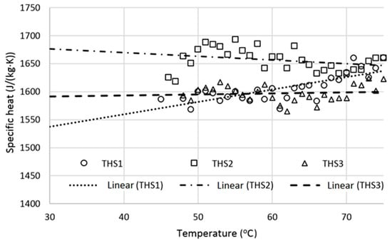 The results of specific heat measurements are shown in Table 6 and in Figure 4 and Figure 5. Specific heats at lower temperatures, down to T = 30 °C, were obtained based on linear extrapolation of the data obtained in the temperature range from 45 to 75 °C (see Figure 4 and Figure 5).