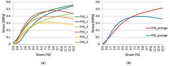 The results of the compressive strength test are shown in Figure 6. The course and trend of the curves for samples from a given mixture are repeatable and differ in the magnitude of the stress at a given strain. However, when comparing the characteristics of the two composites (THS and FHS), it can be noticed that they are different.