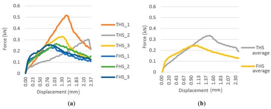 The results of the flexural strength test are shown in Figure 8. In the case of samples from the THS formula, there is a greater variation in the behavior of the samples under static load. One sample was destroyed with a deflection of about 2.30 mm, and the other two with approximately 1.30 mm. In the case of samples from the FHS mixture, the behavior of the samples under increasing load was not very differentiated, which proves a greater homogeneity of the structure of the composite containing fine shives. The failure occurred with a deflection of about 0.8–1.0 mm. The THS samples failed with greater deflection than the FHS samples because the longer shives provided better bonding and worked as dispersed reinforcement. Similar observations are described in [39]. Taking into account the maximum breaking force, the flexural strength of the THS composite was 0.151 MPa, while the FHS composite was 0.110 MPa. However, in the case of the THS composite, the strength of the THS_1 sample differs significantly from the other two, so more samples should be tested to more accurately characterize this composite in terms of the value of the breaking force.