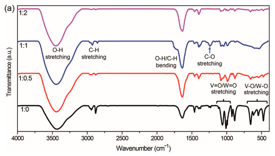To further investigate the credibility of our hypothesis and speculations and the effects of the addition of 1-dodecanol, we examined the FT-IR spectra of W-VEGs prepared at different mixing ratios of EG to 1-dodecanol. The FT-IR spectra of W-VEGs shown in Figure 3a in a range of 4000 to 400 cm−1 clearly present IR bands of O-H stretching (~ 3450 cm−1), C-H stretching (3000 to 2800 cm−1), O-H/C-H bending (1800 to 1500 cm−1), C-O stretching (1239.2 cm−1), V = O/W = O stretching (1100 to 950 cm−1), and V-O/W-O stretching (700 to 400 cm−1). We found that the FT-IR spectrum of W-VEG prepared at the 1:1 mixing ratio of EG to 1-dodecanol was distinctly different from those of other W-VEGs. When we observed the C-H stretching bands in the range of 3000 to 2800 cm−1, the peak positions of W-VEGs prepared at 1:1 were around 2958.6, 2925.8, and 2853.5 cm−1 while those at 1:0, 1:0.5, and 1:2 appeared at around 2958.6, 2940.3, and 2879.5 cm−1, as shown in Figure 3b. The IR bands that appeared in the range of 1800 to 1500 cm−1 are ascribed to the overlapping spectra of O-H bending (~1670–1620 cm−1) and C-H bending in the EG units (~ 1598 cm−1) [25,26,27]. In Figure 3c, a shoulder peak in the range of 1790 to 1700 cm−1 appeared for W-VEG at the 1:1 mixing ratio, while only a strong band centered at around 1638 cm−1 was shown for all the other W-VEGs at the 1:0, 1:0.5, and 1:2 ratios. In addition, a strong IR band characteristic for C-O stretching appeared at 1239.2 cm−1 and a shoulder appeared at around 1286 cm−1 in the FT-IR spectrum of W-VEG at the 1:1 ratio. In contrast, two independent peaks at 1253.6 and 1231.5 cm−1 appeared in the FT-IR spectra of W-VEGs at the 1:0, 1:0.5, and 1:2 ratios. All these variations in the FT-IR spectrum of W-VEG at the 1:1 ratio strongly suggest that the dodecyloxy moiety combined with WOCl4 was incorporated into the W-VEG structure, thereby distinctly changing the peak positions of C-H stretching, O-H/C-H bending, and C-O stretching. One of the most plausible mechanisms to explain these results can be the reaction of NH4VO3 and EG with WOCl4 combined with both EG and 1-dodecanol to form W-VEG.