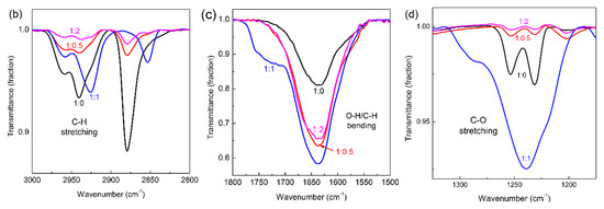 (a) FT-IR spectra of W-VEGs obtained with different mixing ratios of EG to 1-dodecanol at ratios of 1:0, 1:0.5, 1:1, and 1:2 at a fixed WOCl4 concentration of 2.77 mol% relative to NH4VO3, and enlarged spectra of (b) C-H stretching, (c) O-H/C-H bending and (d) C-O stretching.